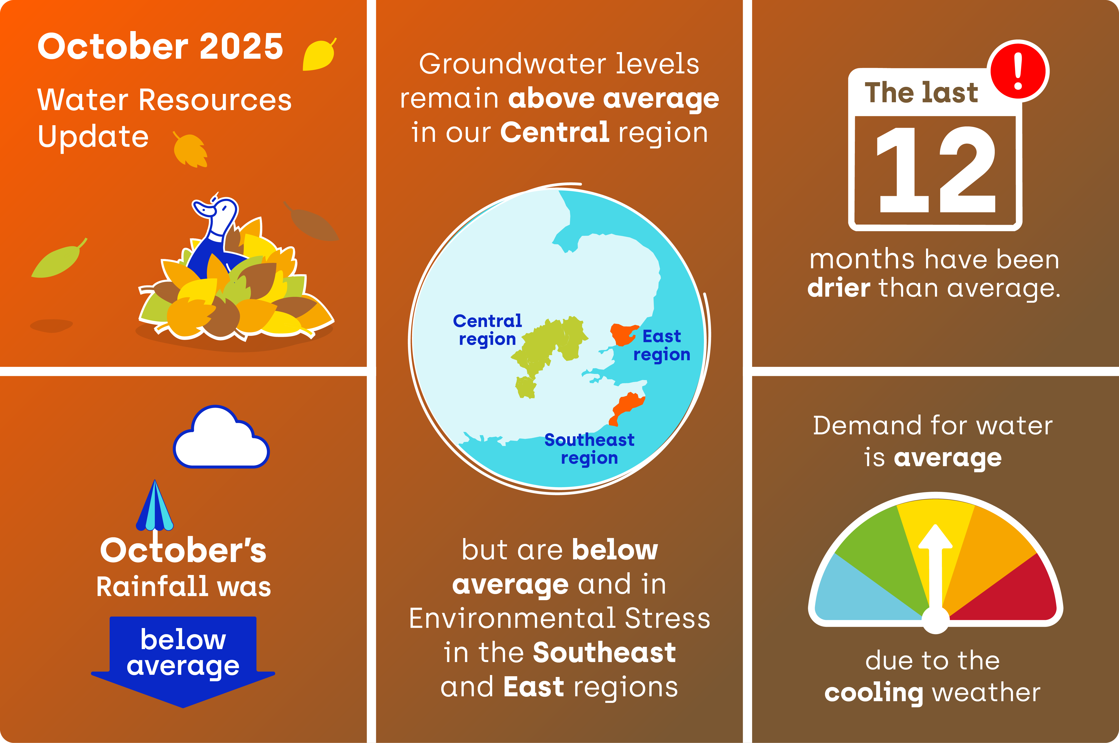 Groundwater levels remain above average in our Central region and below average in our East and South East regions. The East Anglia region has been classified by the Environment Agency as experiencing ‘prolonged dry weather’ and has reached the Environmental Stress trigger outlined in our Drought Management Plan, which is characterised by lack of rainfall and lower than usual river flows.