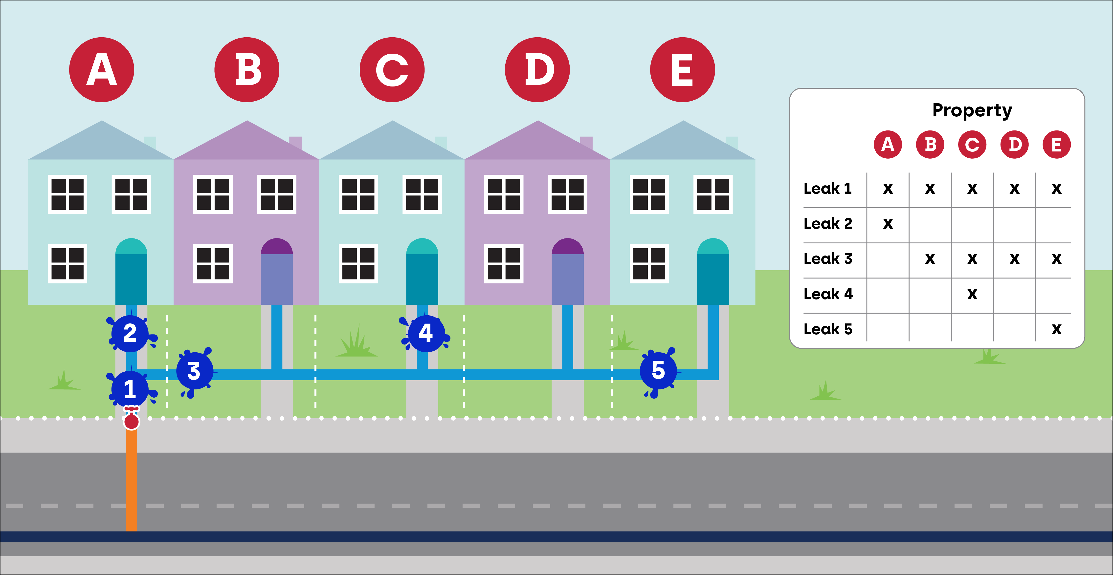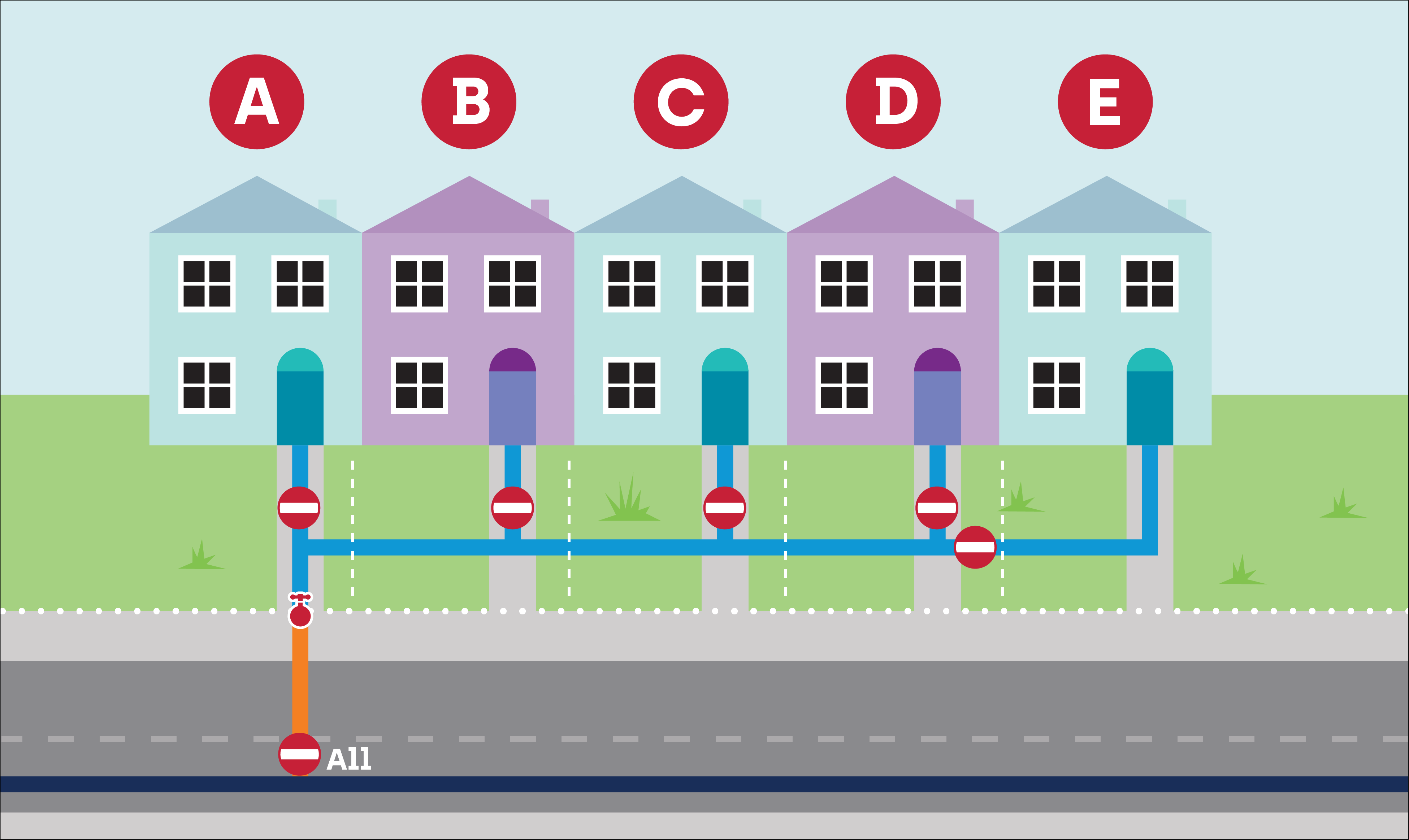 Joint supplies can be complicated as they can serve multiple properties. The diagram below should help you understand your responsibilities should you experience a leak. Find out more about leakage.